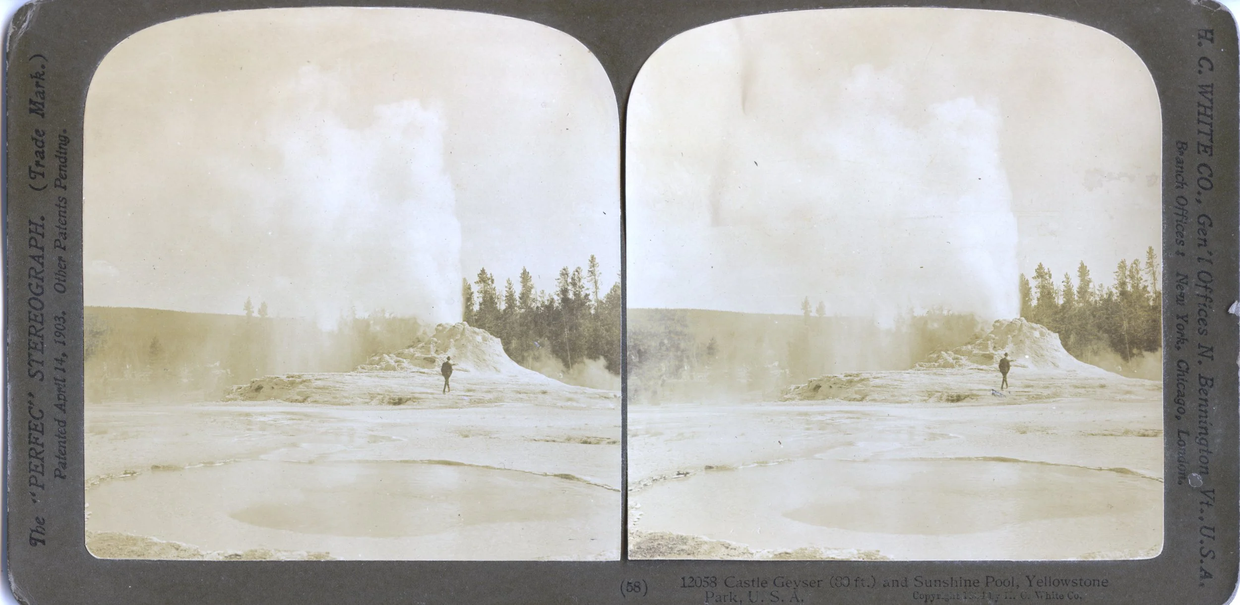 The Riverside Geyser in Yellowstone National Park, in a black-and-white and a colorized stereo image. The “modern” picture was taken in 2002.
