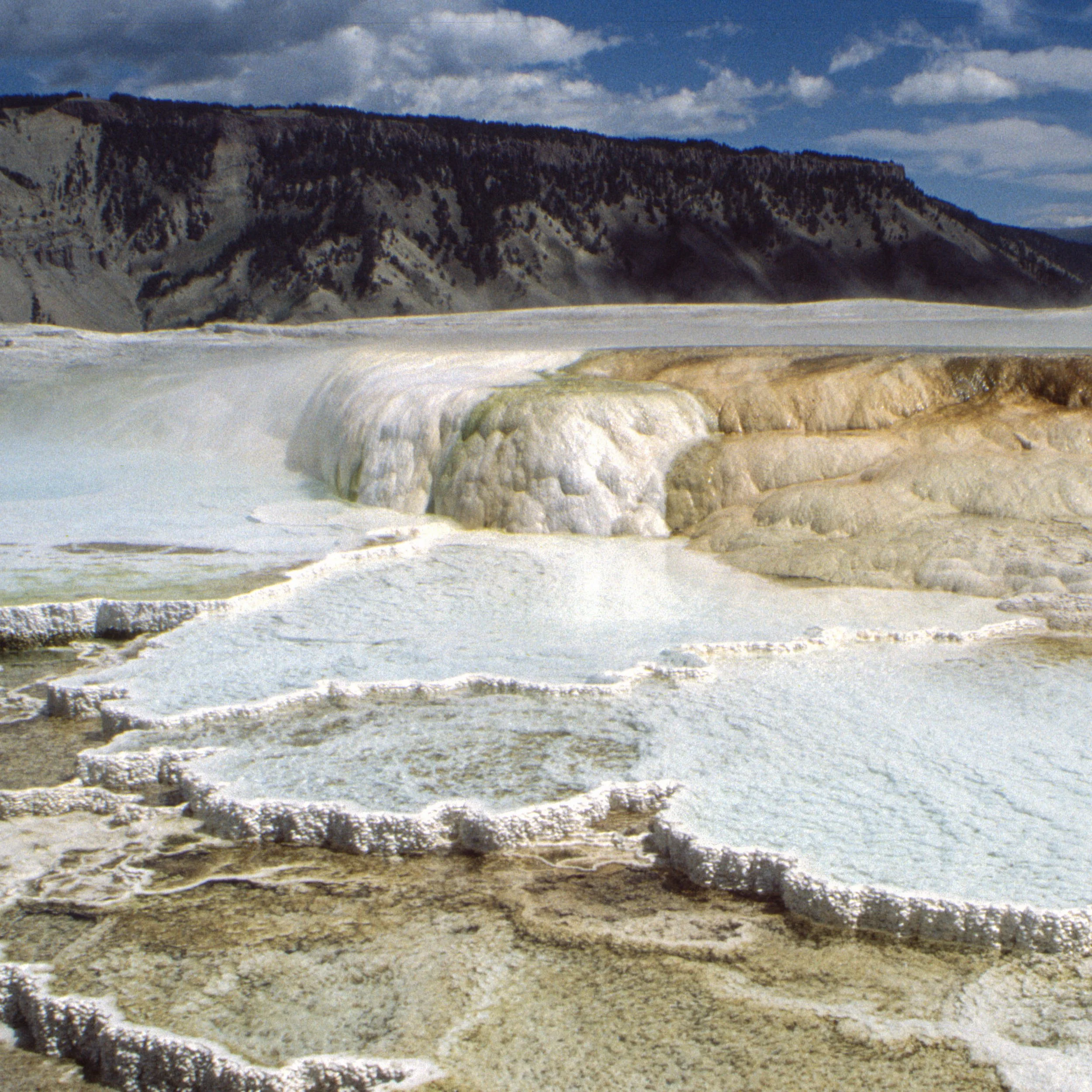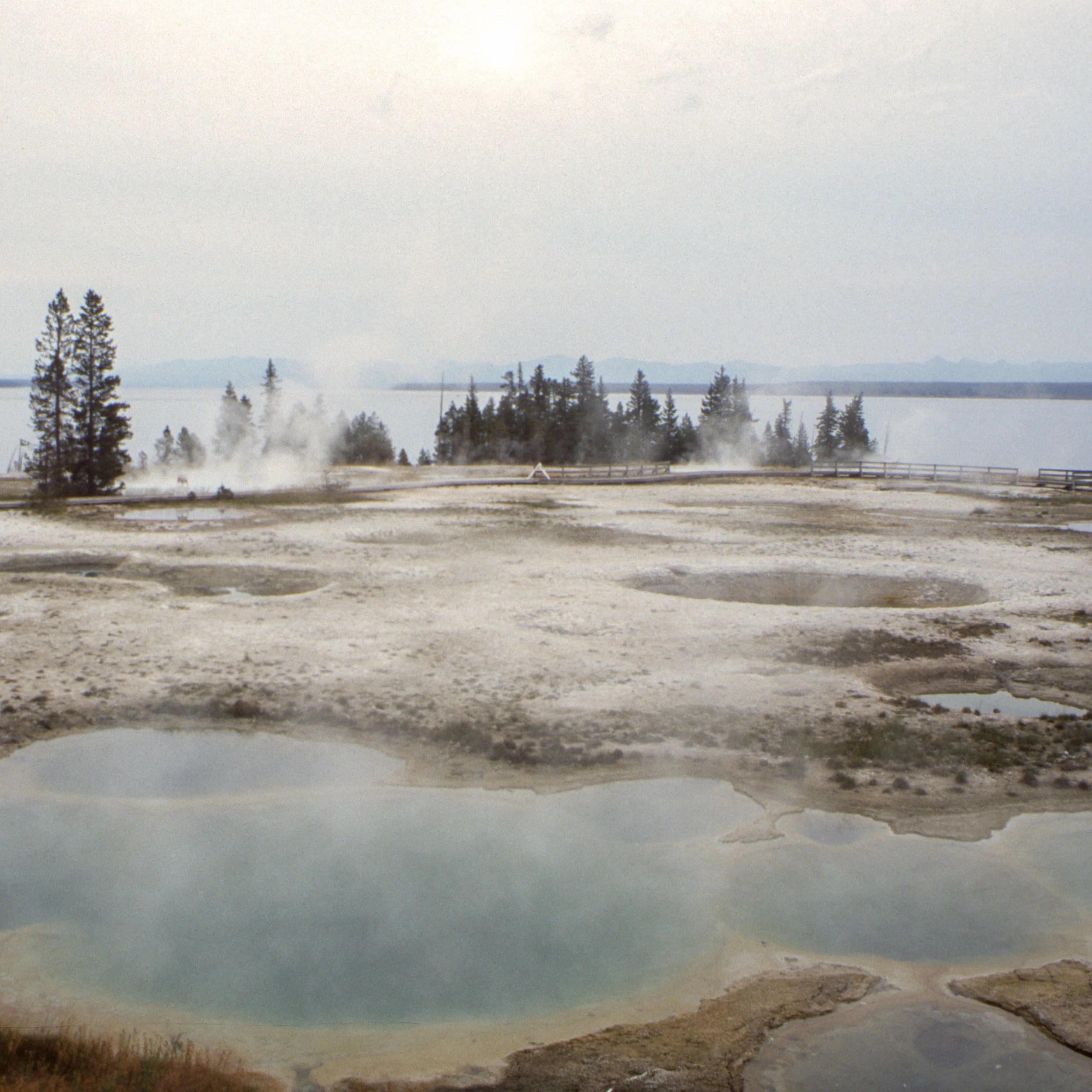 Here are 2 more pairs of stereo photographs, from 1904 and 1905, together with my slides from 2002. The landscape has changed very little, despite the abundant thermal activity. People are no longer allowed to wander freely through the sites, however. The top pair shows Mammoth Hot Springs, the bottom pair shows West Thumb Geyser Basin with Yellowstone Lake.