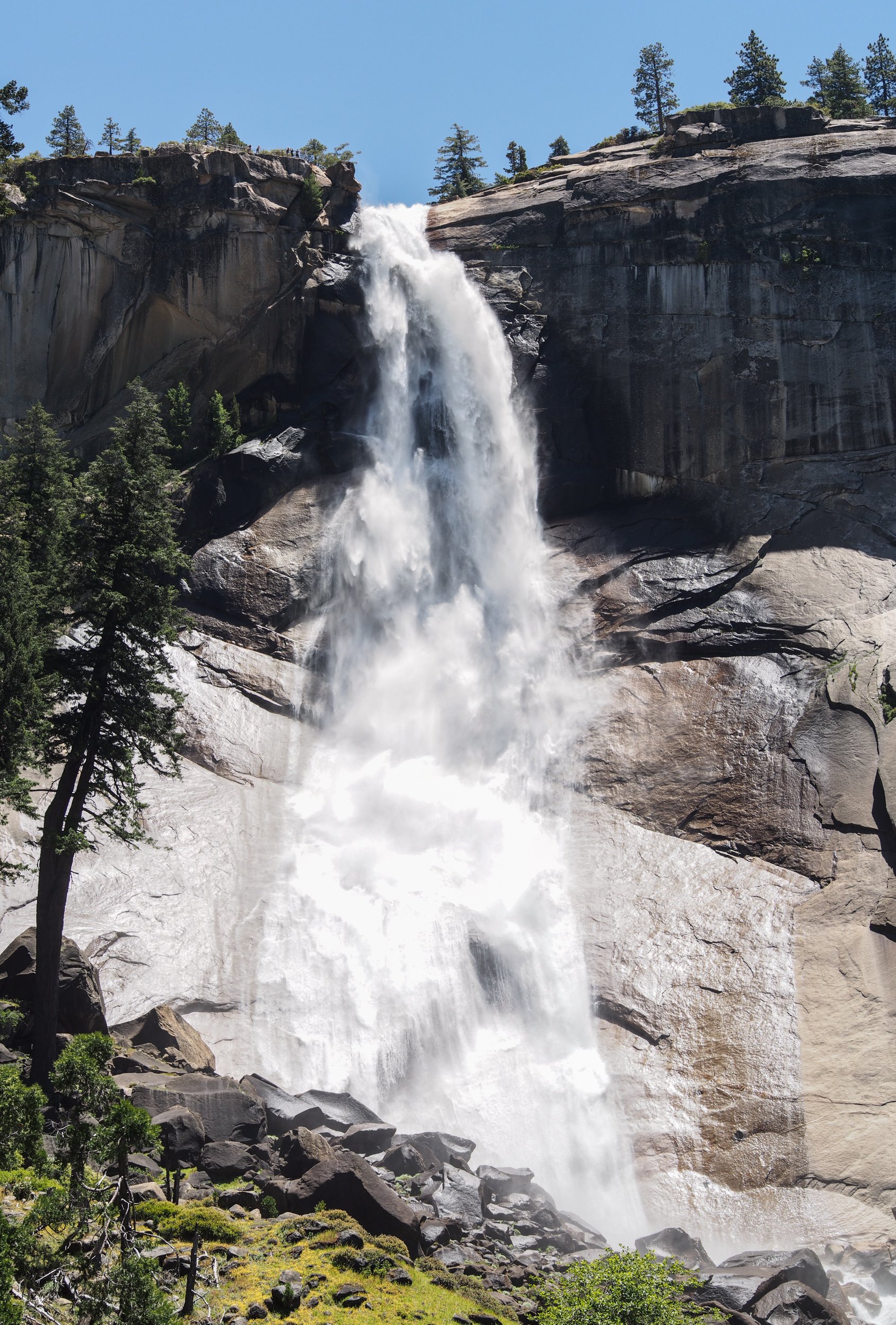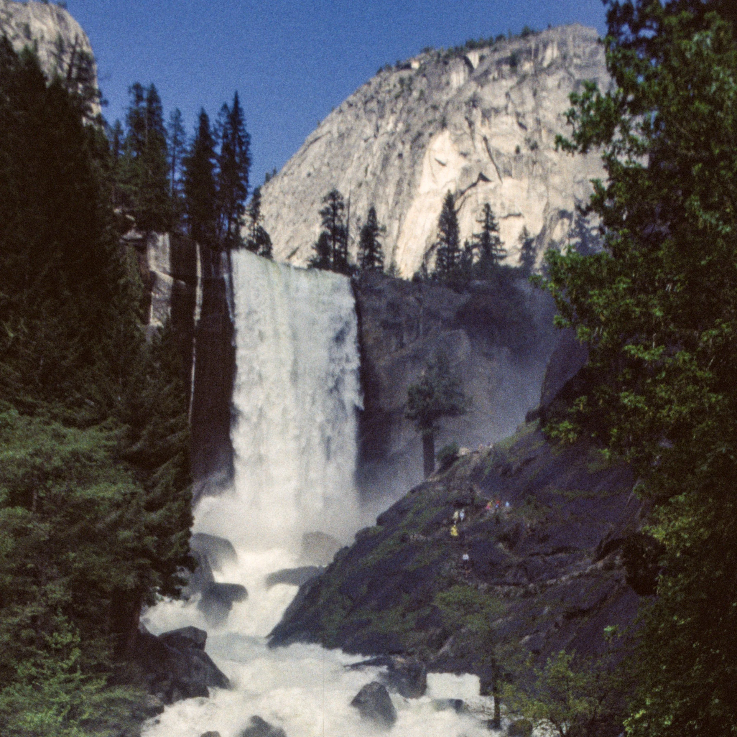 The lower of these waterfalls is Vernal Fall. The top can be reached via the famous Mist Trail, which we hiked in 1968, 1995 and 2013. The picture is from the footbridge over the Merced River, in 1995. The upper fall, Nevada Fall, was photographed in 2013.