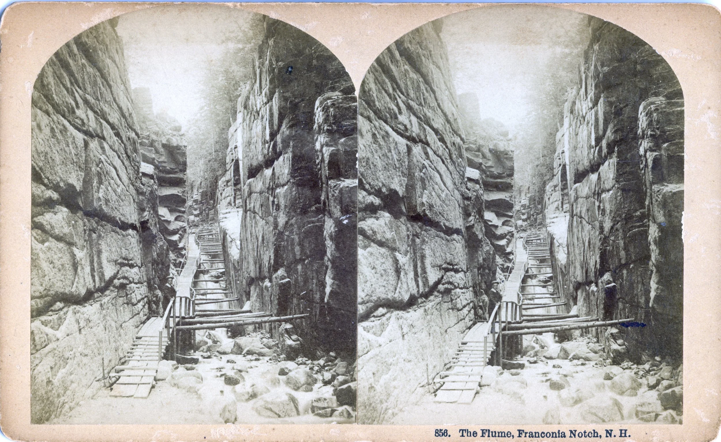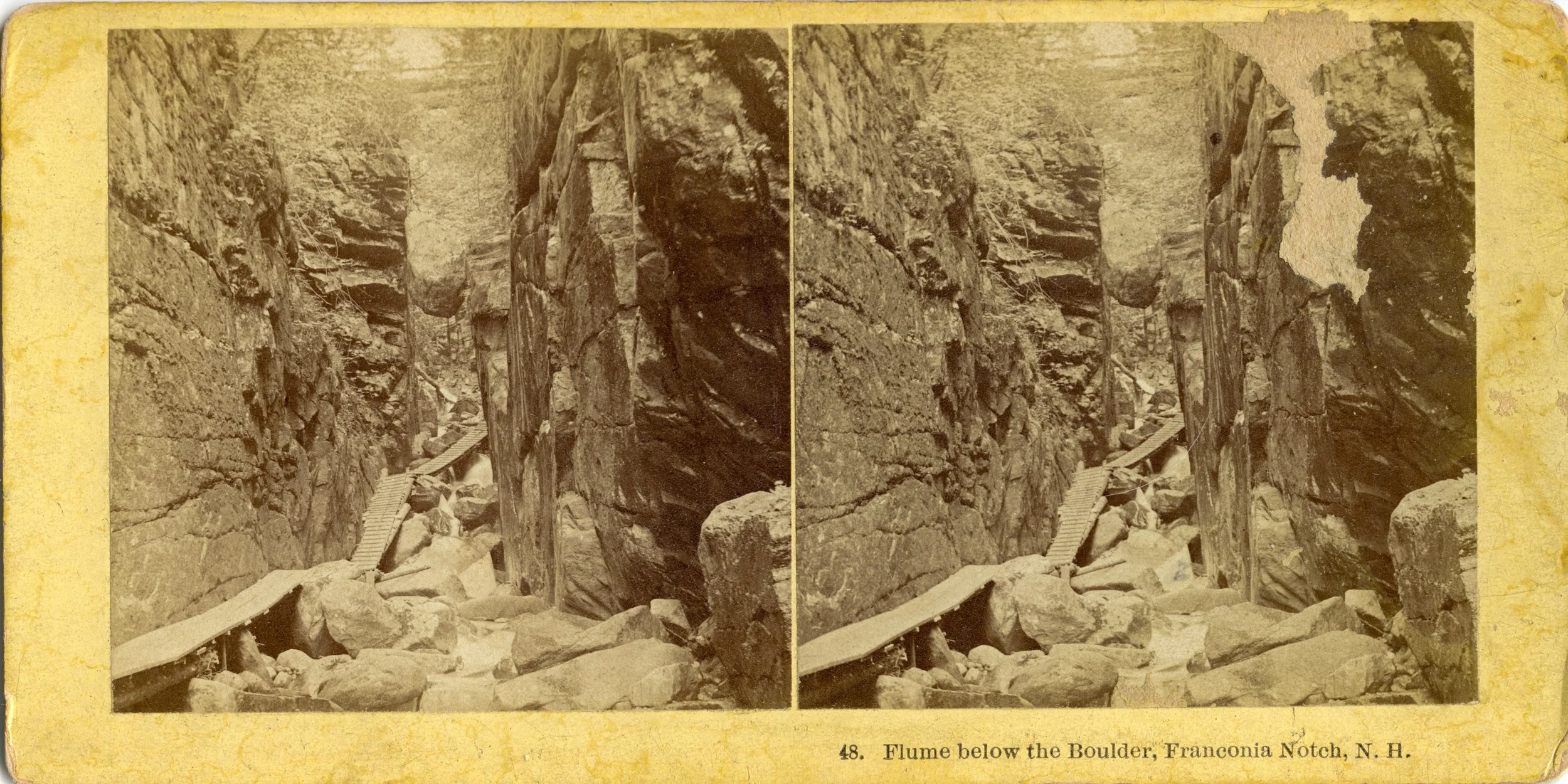 The Flume is a gorge in the Franconia Notch area of New Hampshire. In this picture you can see the big boulder that hung suspended between the walls. It fell down in 1883 so this picture dates from before that year. The second stereo photograph was taken after the disappearance of the boulder in 1883. Our visits to the Flume were in 2003 and 2022.