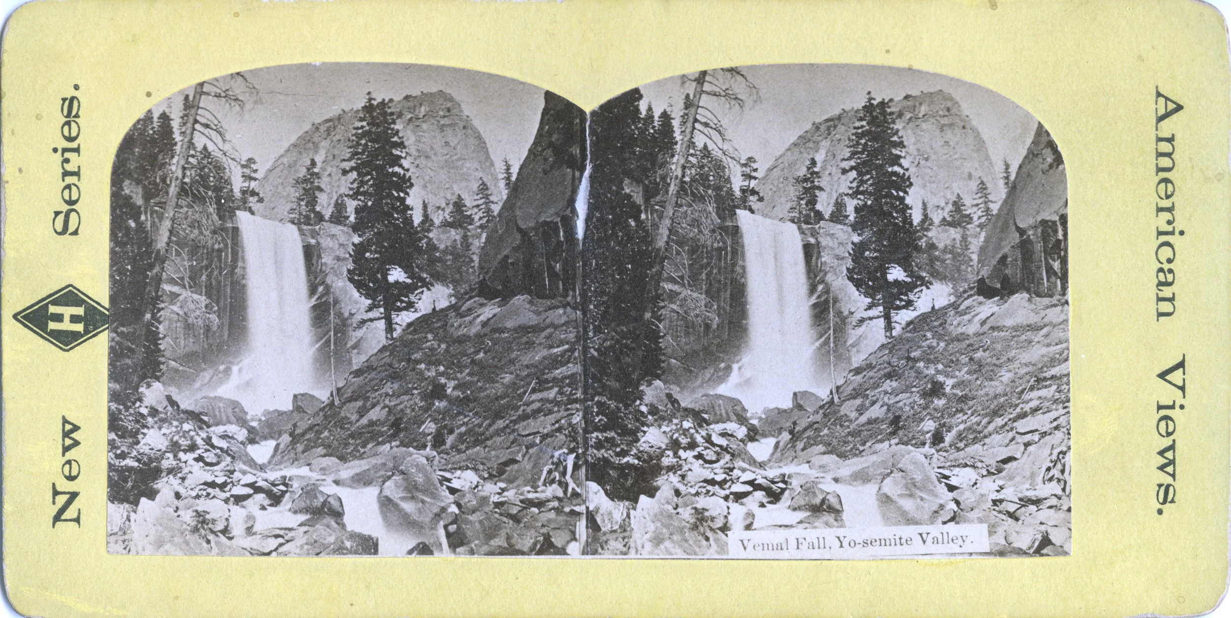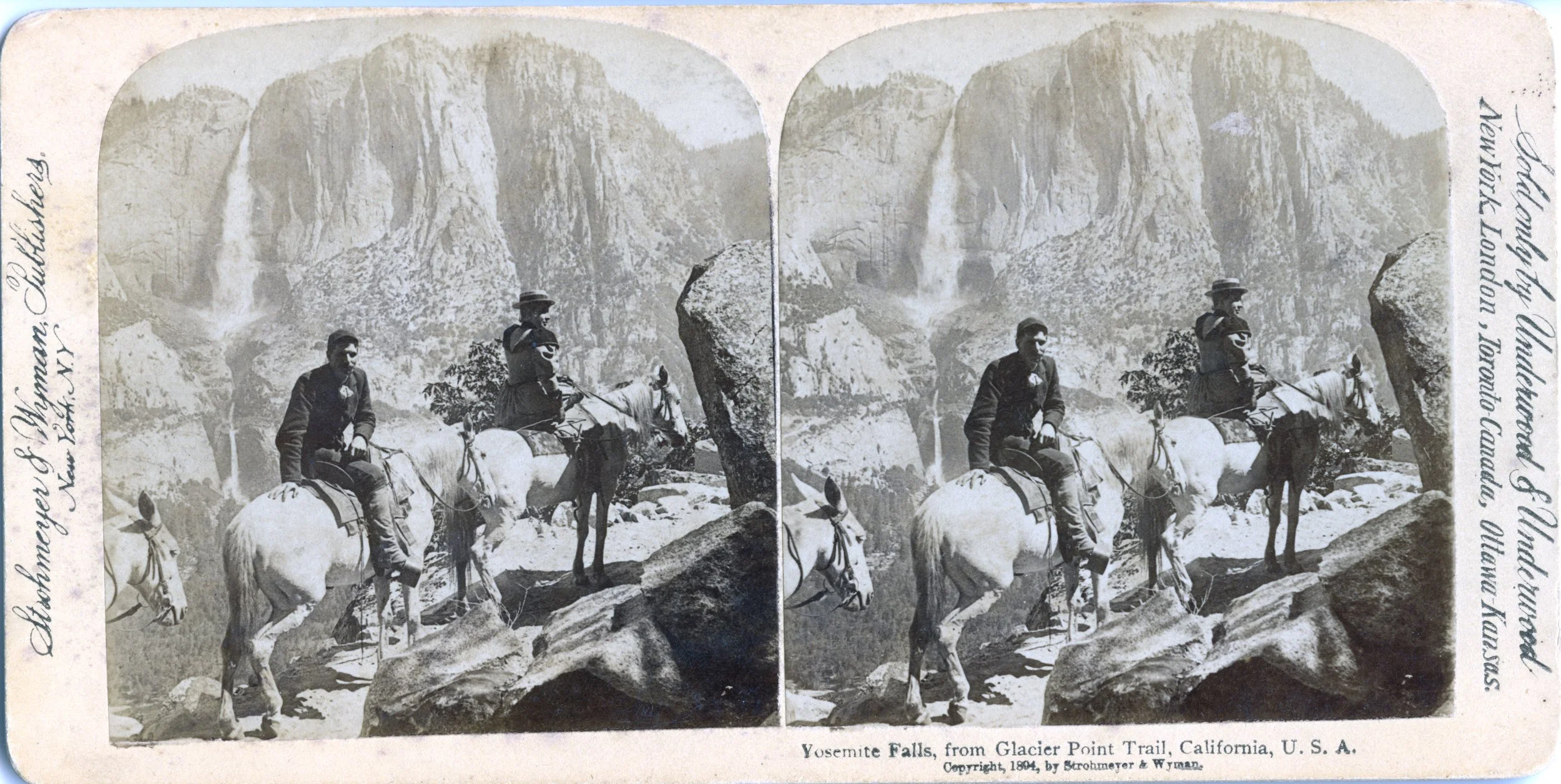 Yosemite Falls is the highest waterfall in the park, totaling 740 m (2425 feet). The stereo photograph is from 1894, taken from the trail that leads to the famous Glacier Point overlook. This trail is now known as the Four Mile Trail (actually 4.8 miles one way). We hiked it in June 1995, with the water flow of the Yosemite Falls at its peak.