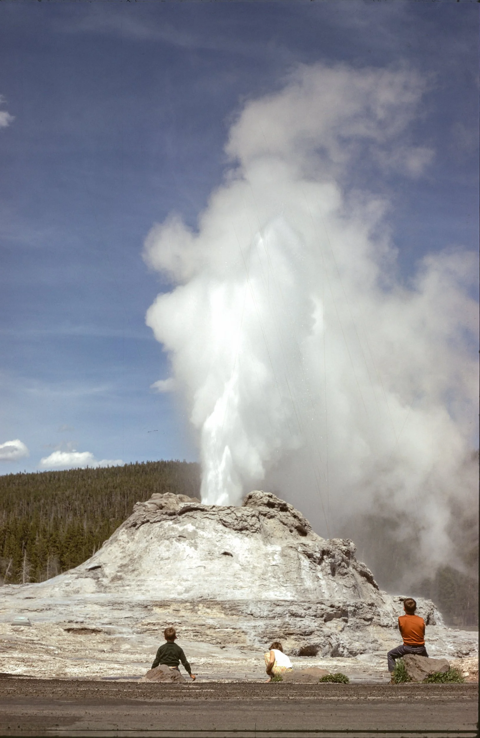 Yellowstone National Park is a favorite topic of these old stereo photographs. This first one shows the Castle Geyser. The color picture was taken by my dad in 1969. I can be seen on the right, with my sister and brother to my left.